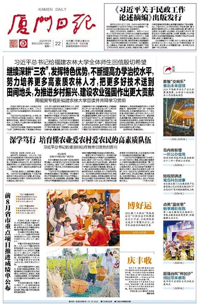 厦门高度重视“三农”工作,将农业农村现代化作为“努力率先实现社会主义现代化”的重要组成部分,持续推进乡村振兴、城乡融合。习近平总书记给福建农林大学全体师生的回信,对厦门深化农业农村改革、农林人才培养、发展都市现代农业、打造宜居宜业和美乡村,具有重要的指导意义。